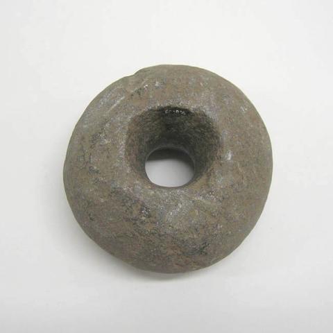 Objeto semi esférico, perforado en el centro. Su textura es irregular y tiene de color grisáceo. Posee una muesca triangular junto a la perforación de una de sus caras.