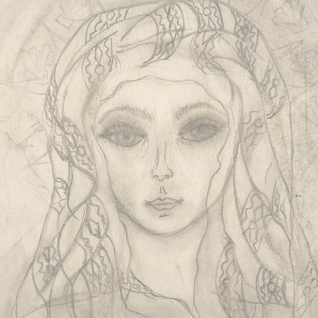 Obra bidimensional monocromática de formato rectangular, composición en base a figura femenina de medio cuerpo frontal, con las manos encontradas por sobre el pecho. Lleva la cabeza cubierta por un paño decorado. Sobre ella una embarcación a velas suspendida, sostenida por un ave ubicada a la derecha.