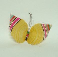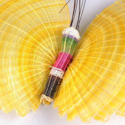 Objeto de uso personal que representa una mariposa. De color amarillo con alas decoradas con franjas de color blanco, verde, rojo, morado, amarillo, blanco, negro y fucsia. Elaborada con una estructura de ixtle sobre la cual pasa el tejido de crin previamente teñido. Las alas son estructuras distintas que van cosidas a la figura central. Lleva un alfiler de gancho por el reverso para prenderlo a la ropa.