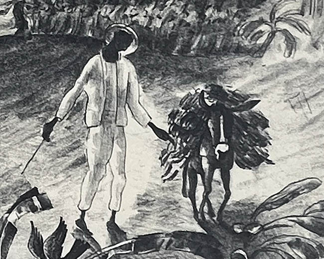 Obra de formato rectángular. Composición en base a una figura masculina y otra femenina de pié en primer plano hacia la izquierda de la imagen, junto a ellos en el centro dos perros, a sus costados una vegetación frondosa. El hombre viste traje, sombrero y en su mano derecha lleva un bastón, mientras que la mujer vestido y trenzas. En segundo plano se ve una figura masculina morena de frente y de pié, viste pantalón, polera y sombrero, sostiene en su mano derecha un balde y con su mano izquierda y sobre el hombro una herramienta. A la derecha otra figura masculina de pié frente a un arbusto con camisa y pantalón. En tercer plano una choza, vegetación, ganado y cerros.