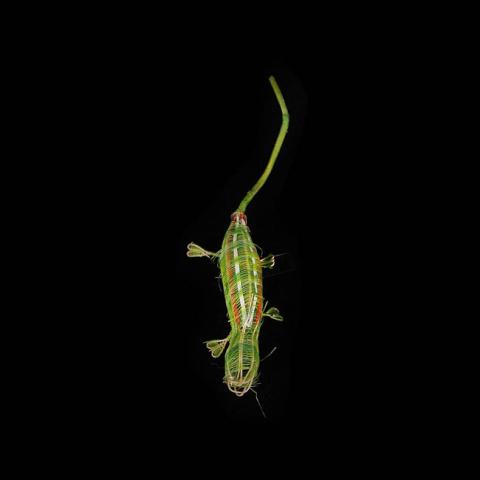 Figura herpetomorfa de uso decorativo. Tiene cuerpo alargado, y una cola delgada. De color verde, decorada con lineas de color blanco y rojo en el dorso. Elaborado en una estructura de ixtle sobre la cual pasa el tejido de crin previamente teñido. Las patas son figuras distintas y están cosidas a la figura principal.