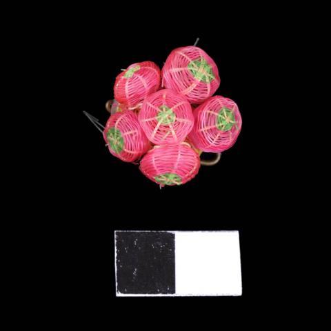 Objeto de uso personal. Tiene seis esferas de color fucsia con un centro verde. Cada esfera esta elaborada en una estructura de ixtle sobre la cual pasa el tejido de crin previamente teñido. Por el reverso, un broche de metal.