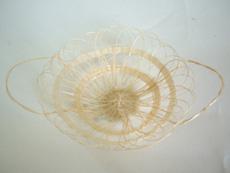 Objeto decorativo. Cuerpo cóncavo tejido de trama abierta, dos asas laterales formadas por hebras entrecruzadas. Elaborado en una estructura de ixtle.