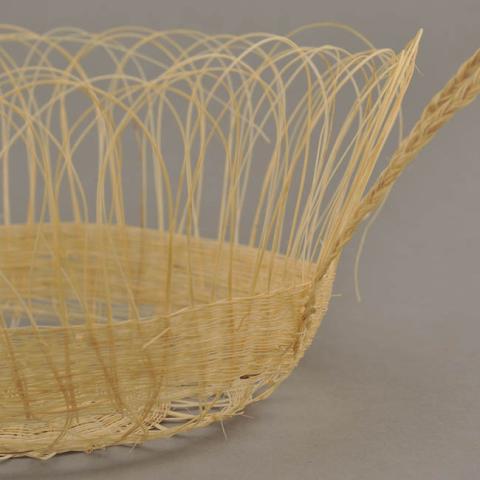 Objeto de uso decorativo. Es redondo y bajo, con boca ancha y dos asas laterales verticales. Las asas son hebras entrelazadas y parte del mismo tejido. De color natural de crin sin teñir. Elaborado en una estructura de ixtle sobre la cual pasa el tejido.