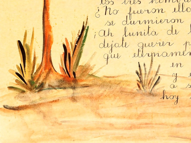 Obra de formato rectangular vertical, conformada por un texto ilustrado. La ilustración ubicada en la parte izquierda, consiste en un árbol con follaje verde en algunas ramas y con las otras peladas, viéndose a su derecha una luna verde y con un reflejo amarillo. El texto ubicado en la parte derecha de la obra, está manuscrito con letra cursiva en color negro, estando titulado "Luna Reina". Soporte amarillento.