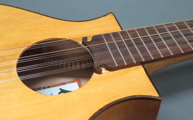 Cordófono pulsado, compuesto por un clavijero con 12 clavijas, 12 cuerdas, un mástil y una caja de resonancia. La madera del clavijero y del mástil es más oscura por el anverso estando decorado con una cruz escalonada ubicada en la parte superior. Las clavijeras son blancas y las cuerdas son de metal. La caja tiene la parte superior recta, prosiguiendo con una forma de cintura y finalizando en curva; tiene por el anverso un puente al centro donde finalizan las cuerdas y una pieza oscura y curva adosada al del borde inferior. El acabado de la pieza es pulido y semi brillante.