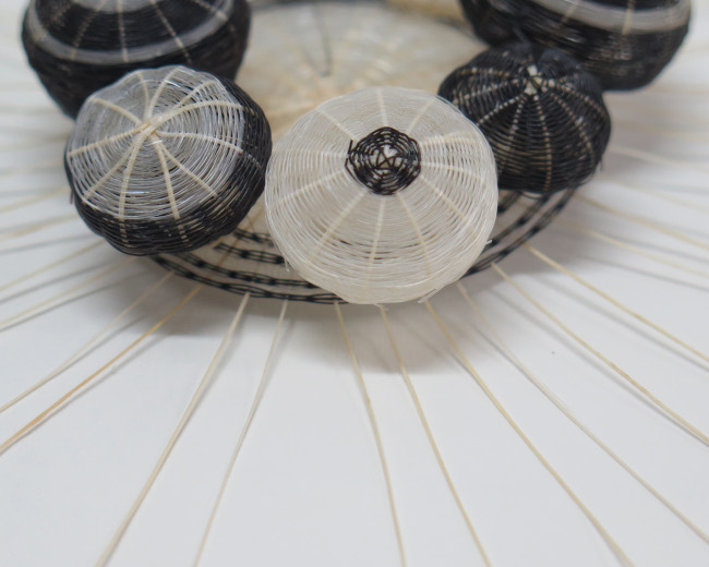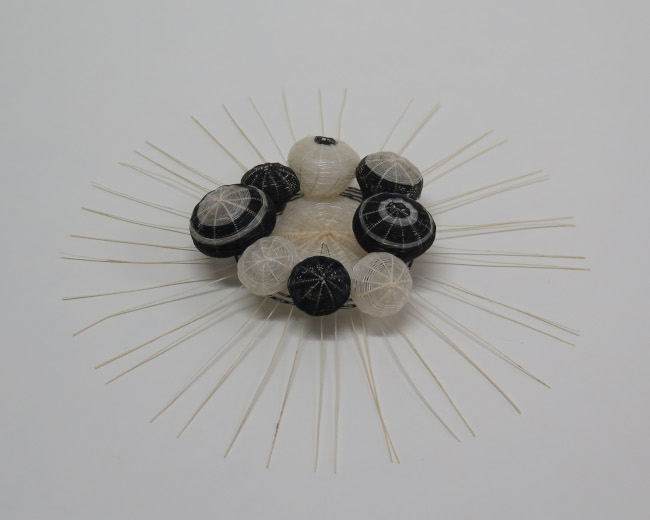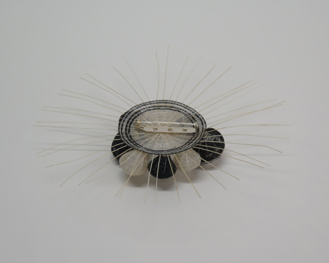 Objeto conformado por 8 piezas esféricas de variados tamaños en color blanco y negro alternado. Están sobrepuestas alrededor de una base plana, que es blanca al centro y con 4 líneas negra en el borde. Por el reverso posee alfiler de gancho de metal plateado.