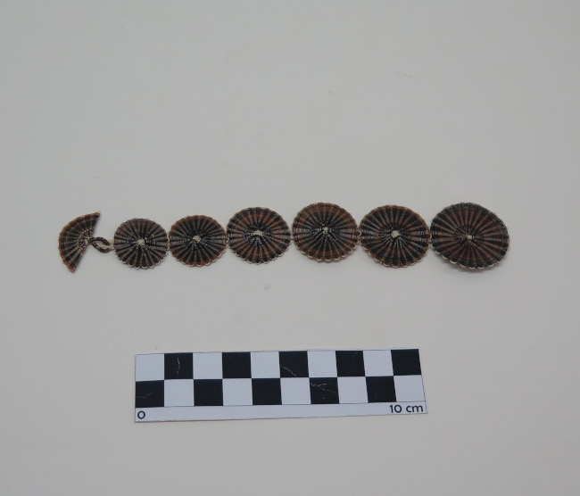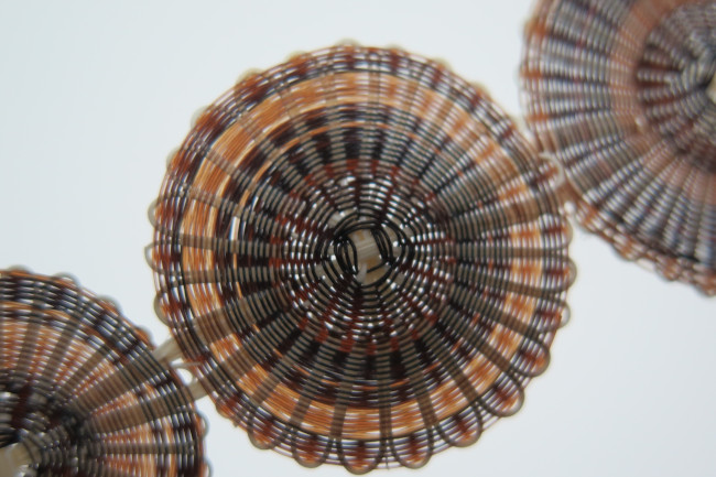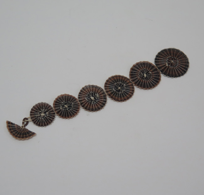 Pieza plana, con formada por seis discos tejidos, colocados uno al lado del otro en tamaño decreciente, rematado en un pequeño abanico conectado por argolla. Las piezas son de color café claro o negro alternado.