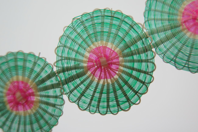 Pieza plana, con formada por seis discos tejidos, colocados uno al lados del otro en forma decreciente, rematado en un pequeño abanico conectado por argolla. Las piezas son de color verde al exterior, con una franja amarrilla delgada más al interior y el centro fucsia.