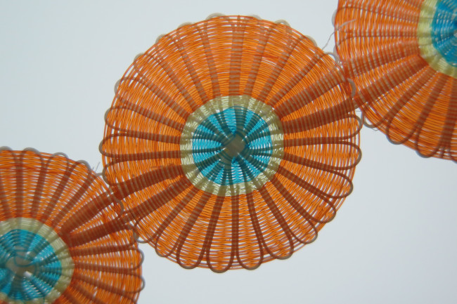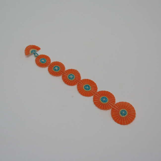 Pieza plana, con formada por seis discos tejidos, colocados uno al lados del otro en tamaño decreciente, rematado en un pequeño abanico conectado por argolla. Las piezas son color naranjo al exterior, con una franja amarrilla delgada más al interior y el centro turquesa.