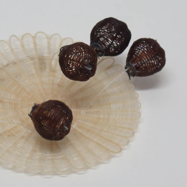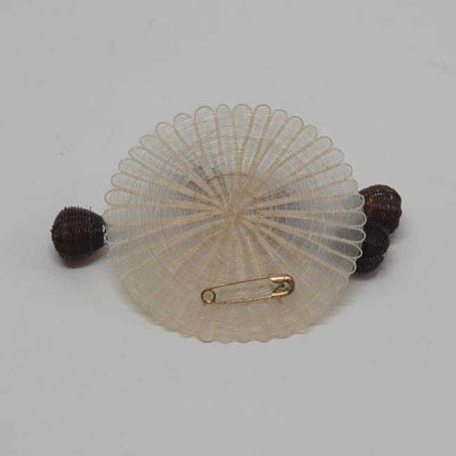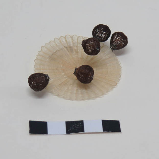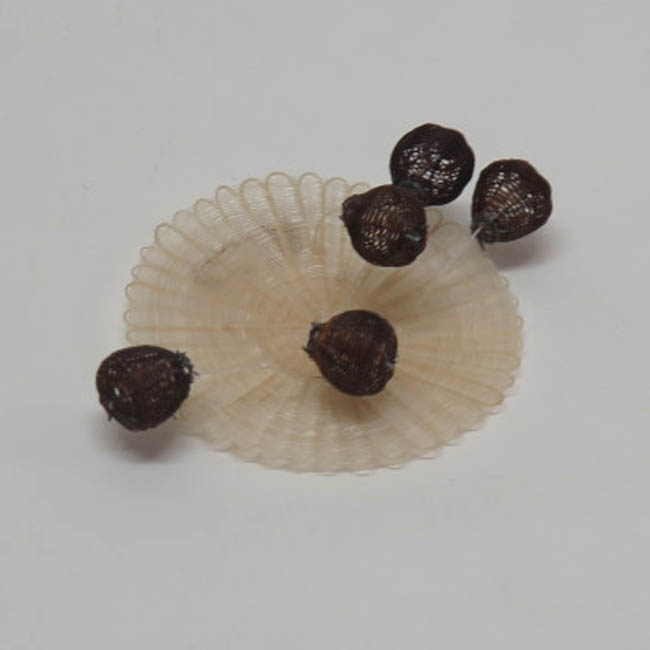 Pieza con volumen, conformada por una base en forma de disco de color blanco, del cual sobresalen cinco hebras que rematan en su parte superior, en esferas café.