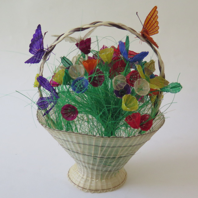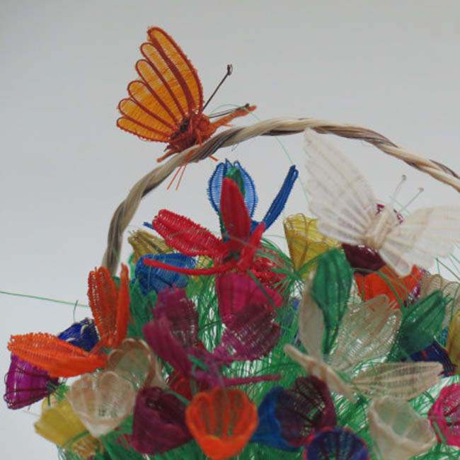 Figura tejida que representa un canasto de color claro, con cuerpo cóncavo, base convexa baja y un gran asa superior trenzada. En el interior lleva pequeñas flores de variados colores, cuyos tallos son de color verde. Sobre el asa se posan dos mariposas, una de color morado y otra naranja.