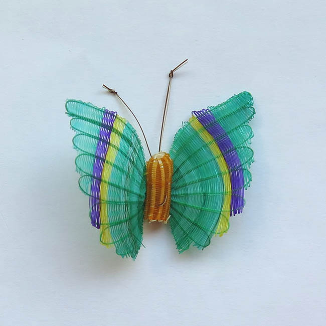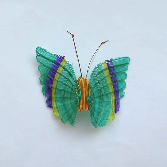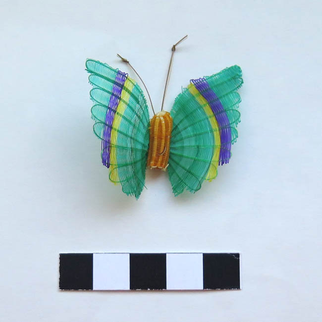 Figura zoomorfa, tejida. Representa una mariposa con alas de color verde con bordes dentado, decoradas con una línea morada y otra amarilla dispuestas en forma vertical. El cuerpo tiene forma cilíndrica, de color amarillo y las antenas son una hebra doble, color café y terminadas en un nudo. Las alas están cocidas al cuerpo por un hebra color amarillo que se ve por el reverso.