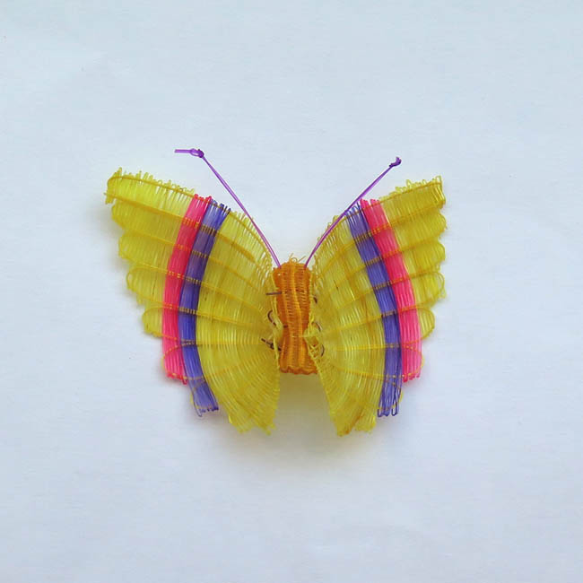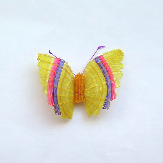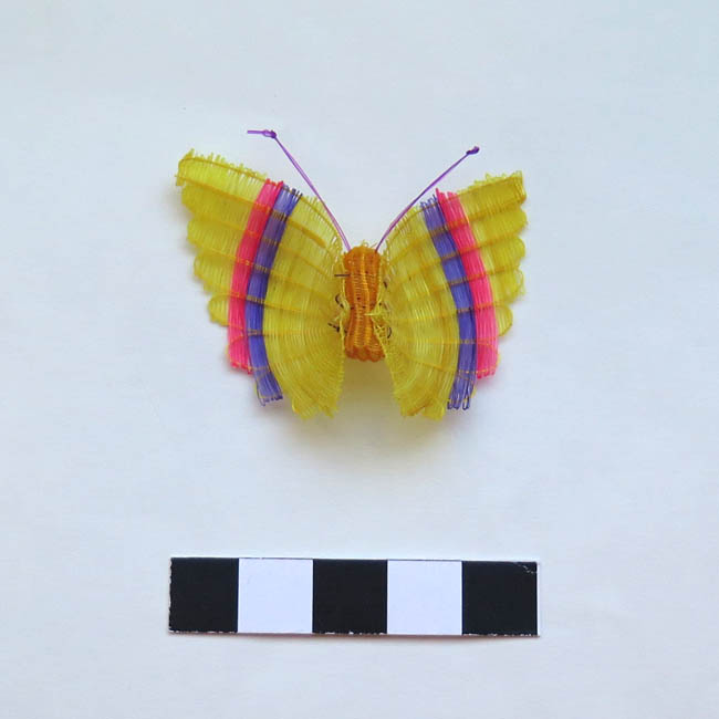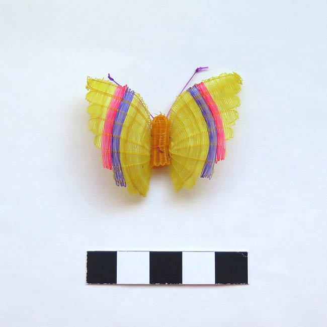 Figura zoomorfa, tejida. Representa una mariposa con alas de color amarillo con bordes dentado, decoradas con una línea fucsia y otra morada dispuestas en forma vertical. El cuerpo tiene forma cilíndrica, es color anaranjado y las antenas son una hebra doble, color violeta y terminadas en un nudo. Las alas están cocidas al cuerpo por un hebra color morado que se ve por el reverso.