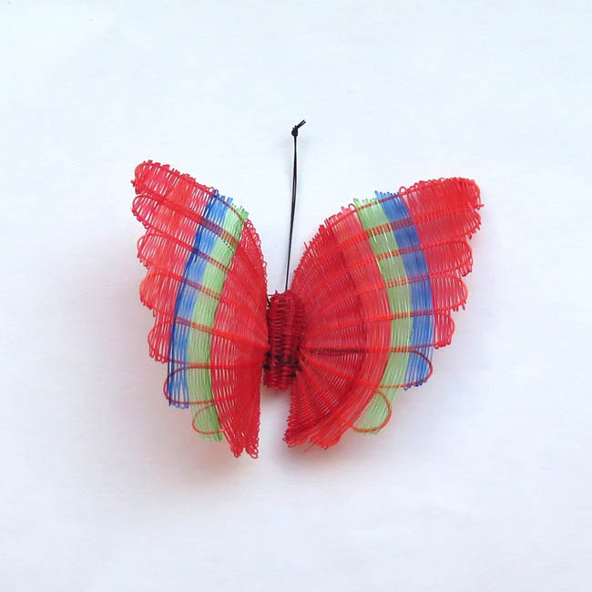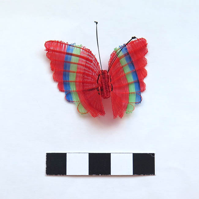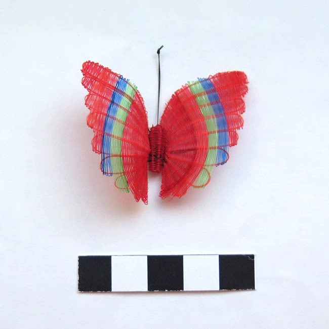 Figura zoomorfa, tejida. Representa una mariposa con alas de color rojo con bordes dentado, decoradas con una línea azul y otra verde dispuestas en forma vertical. El cuerpo tiene forma cilíndrica, es color rojo y las antenas son una hebra doble, color negro y terminadas en un nudo. Las alas están cocidas al cuerpo por una hebra color negro que se ve por el reverso.