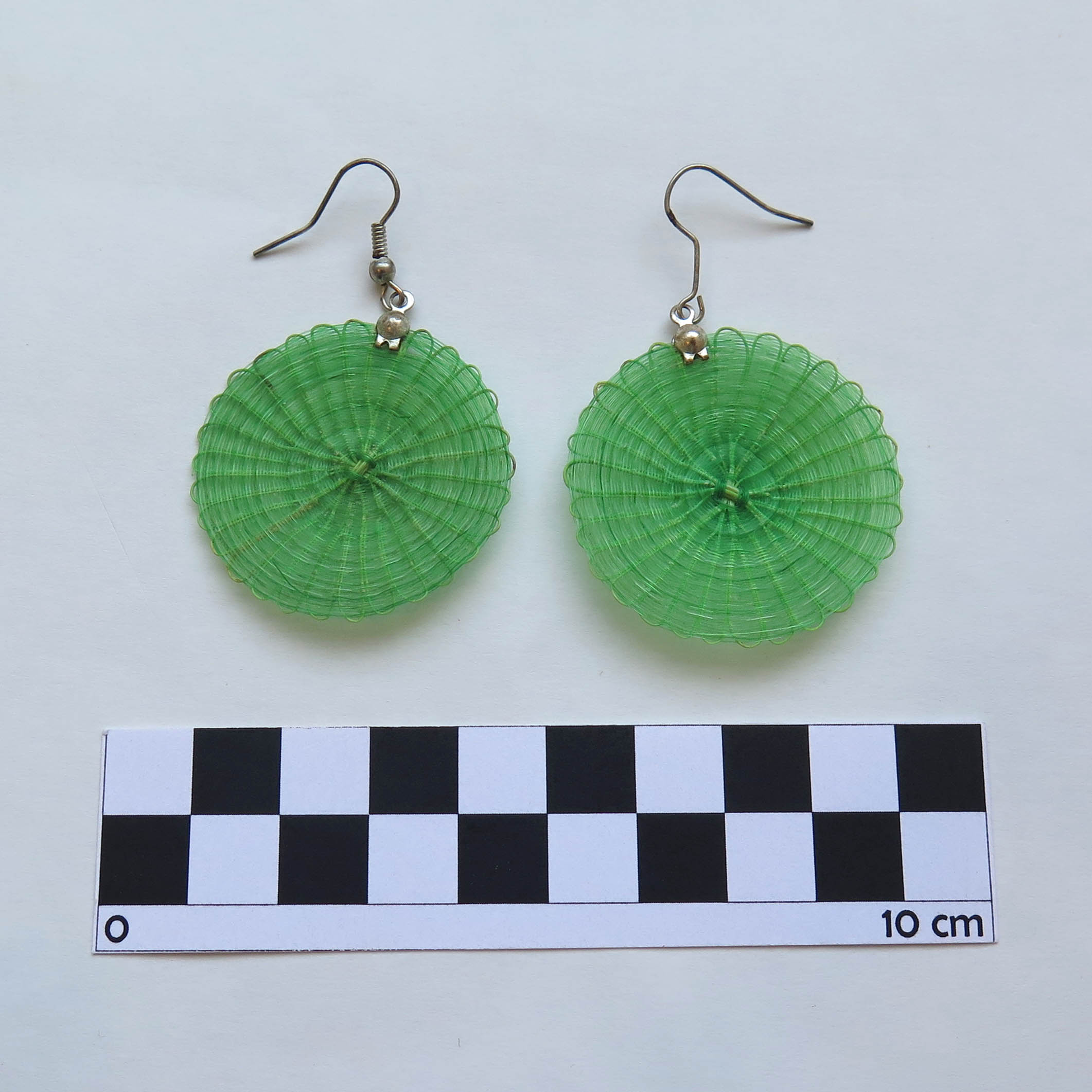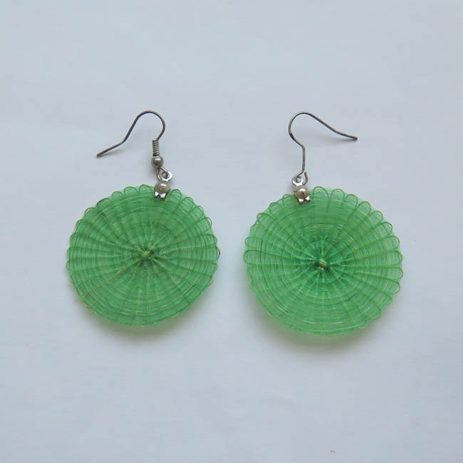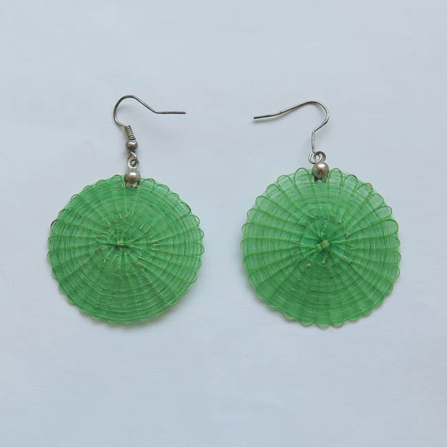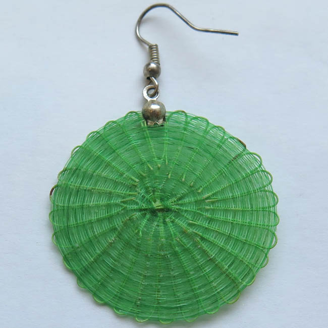 Adorno para las orejas, tejido con forma aplanada, Está conformado por un disco color verde de acabado homogéneo, que en parte superior posee gancho delgado de metal plateado.