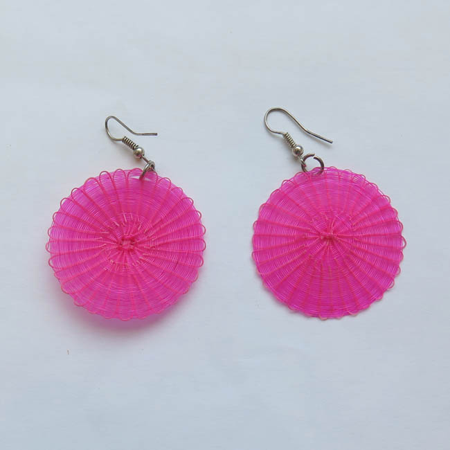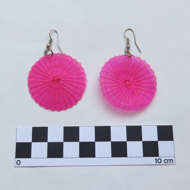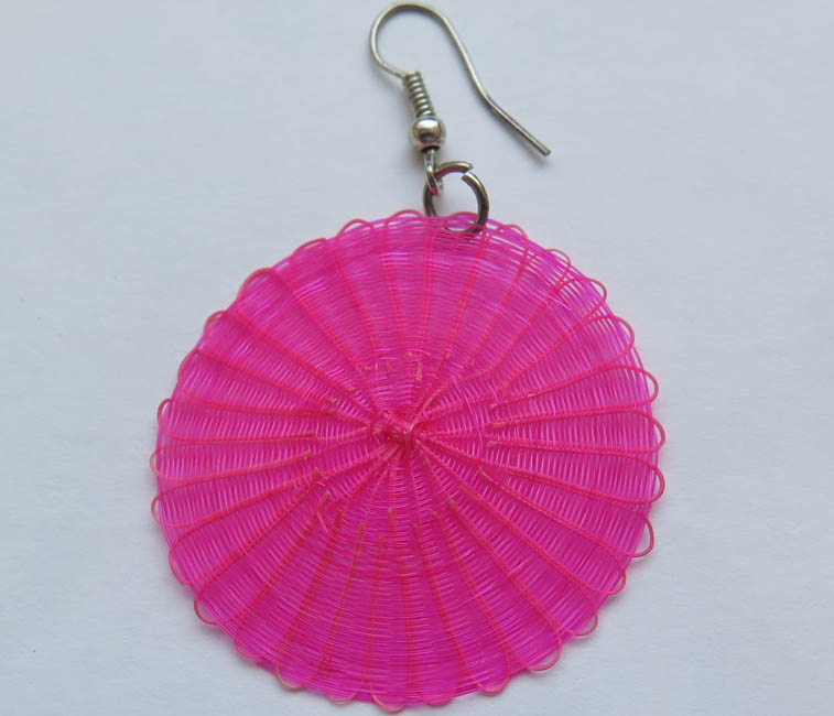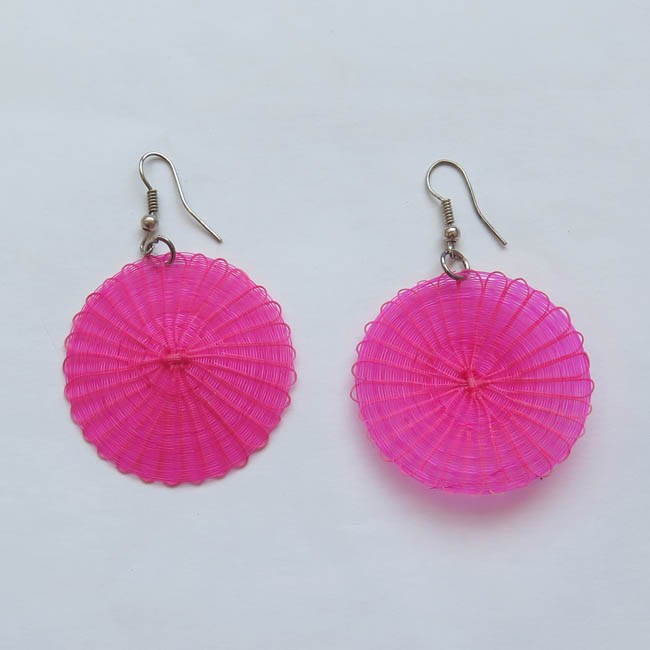 Adorno para las orejas, tejido con forma aplanada, Está conformado por un disco color fucsia de acabado homogéneo, que en parte superior posee gancho delgado de metal plateado.