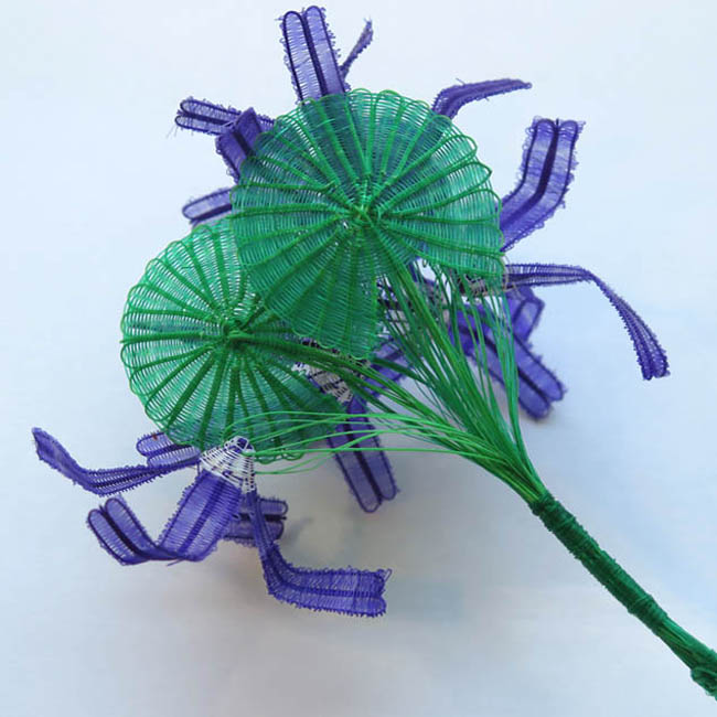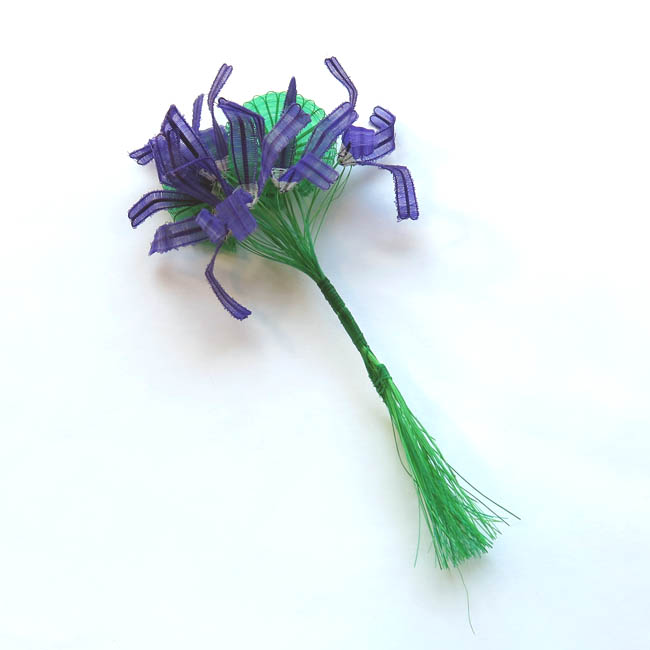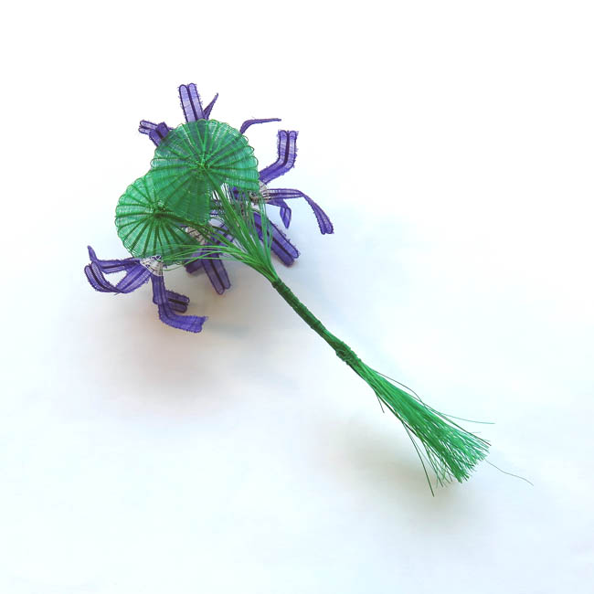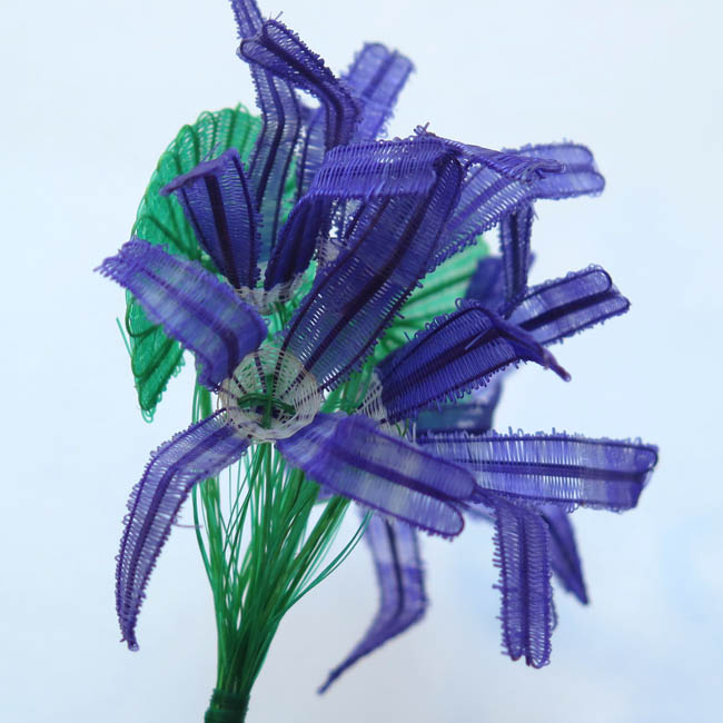 Figura tejida con diseño fitomorfo. Está conformada por un atado de seis flores de color morado, teniendo cada una cuatro pétalos de forma recta y alargada con un doblez en su parte central; y el centro de las flores es de color blanco y con forma cóncava. En la parte posterior del ramo hay dos hojas con forma de abanico, siendo de color verde. Los tallos de las flores y de las hojas lo conforman múltiples hebras de color verde, estando embarriladas en la parte central.