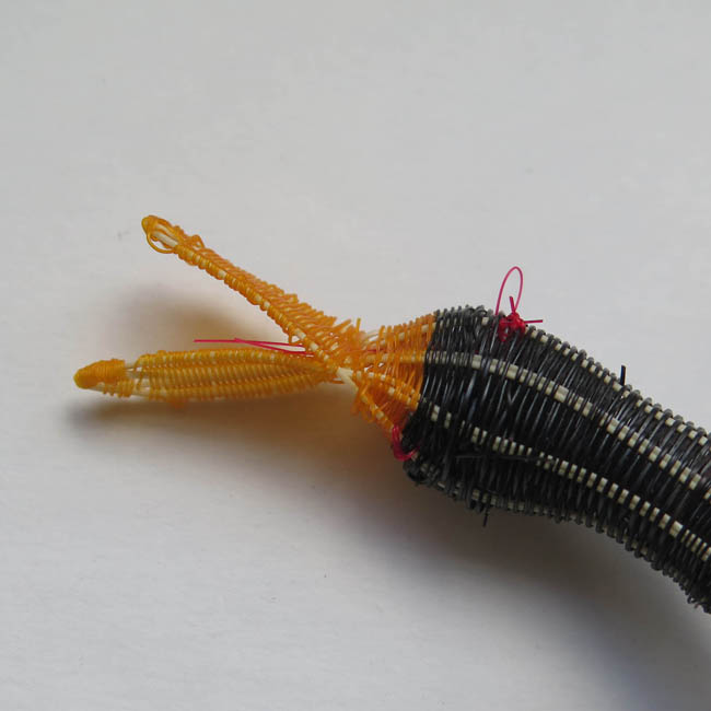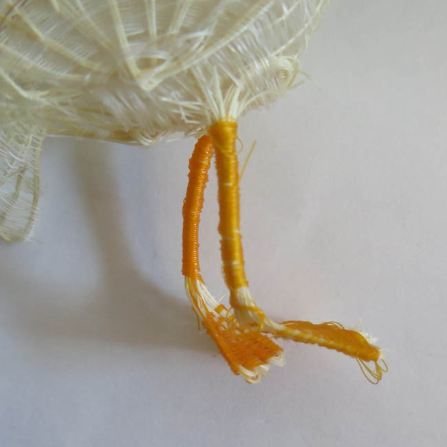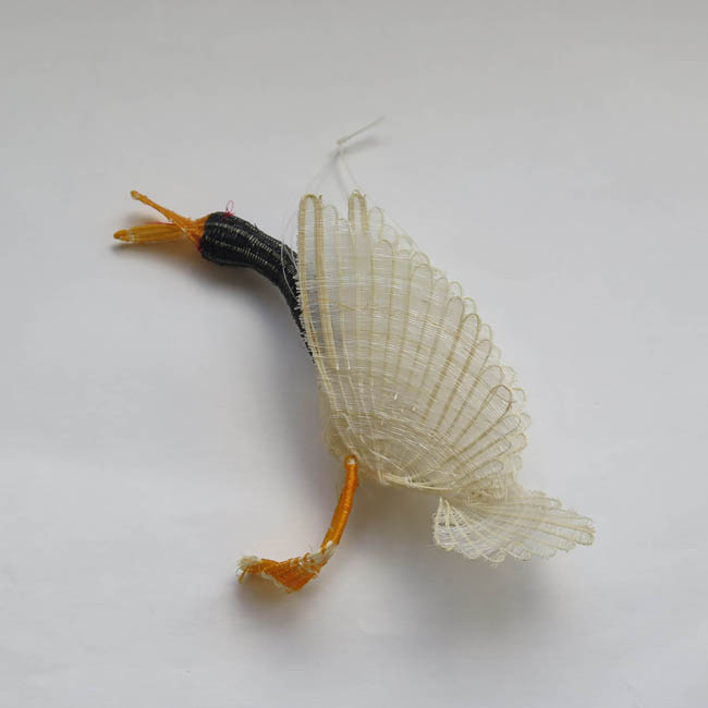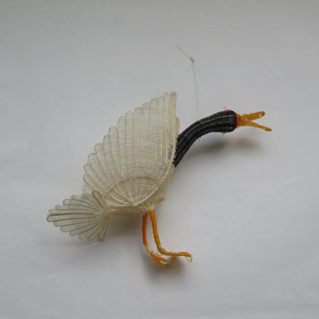 Figura ornitomorfa, tejida. Representa un ave con cuerpo en tonos cafés,que lleva sus alas levantadas y pegadas al cuerpo y su cola a la altura de las patas. Su pico es plano y de color naranjo, sus ojos son pequeños y rojos, y las patas son palmeteadas. En la cola tiene tejido fibra de color morado. En su espalda posee hebras de crin para ser colgado.