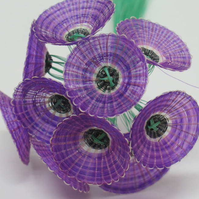 Objeto fitomorfo tejido. Corresponde a un ramo de diez flores de color magenta con forma cónica, cuyo centro es color negro y por donde se cruzan los tallos de la rama. Su tallo está conformado por muchas fibras, de color verde y embarrilado con un tono más oscuro en parte superior, y estando dividido en tres secciones más abajo.