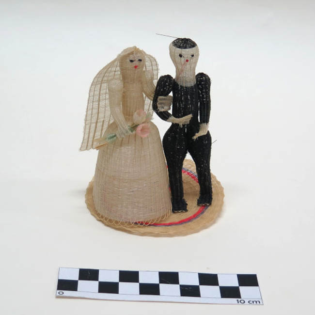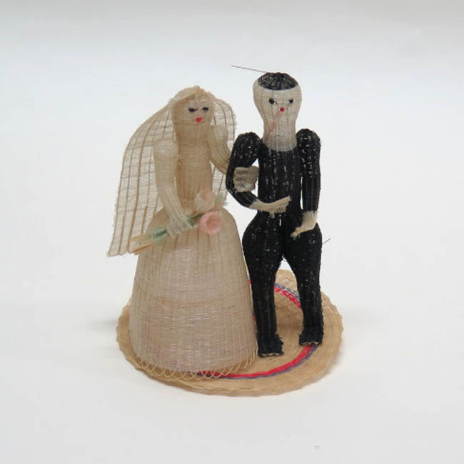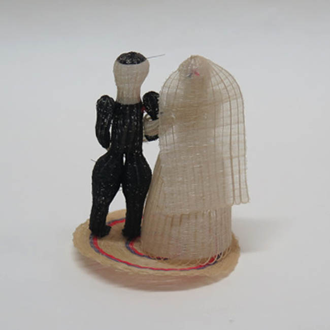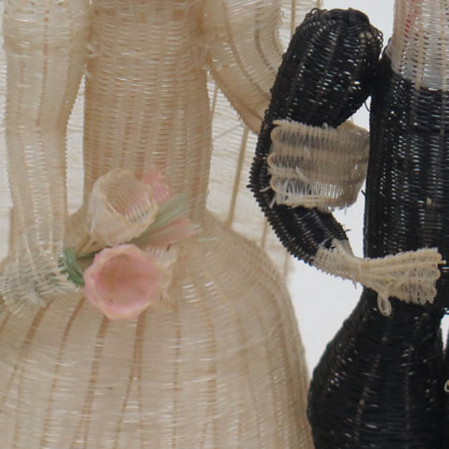 Figura tejida, conformadas por una pareja de personas que están de pie. A la derecha se aprecia una mujer vestida de blanco, que posee un velo largo que le llega hasta la altura de las piernas y un vestido largo de forma acampanada; sus ojos son negros y su boca roja, formada por unos nudos; su brazo derecho lo tiene junto al cuerpo sosteniendo con la mano un ramo de cuatro flores (dos blancas y dos rosa pálido) con ramas color verdes pálido; con su mano izquierda sostiene el brazo del hombre. La figura masculina tiene pelo y el cuerpo color negro; su rostro, cuello y manos son blancas; sus ojos son negros y su boca roja, formados por nudos; el brazo derecho está doblado, posando su mano sobre el vientre y el izquierdo cae junto a su cuerpo, llevando la mano doblada; sus muslos son globulares y los pies son planos. Ambos están parados sobre una base circular de color crudo con unas delgadas granjas morada y fucsia.