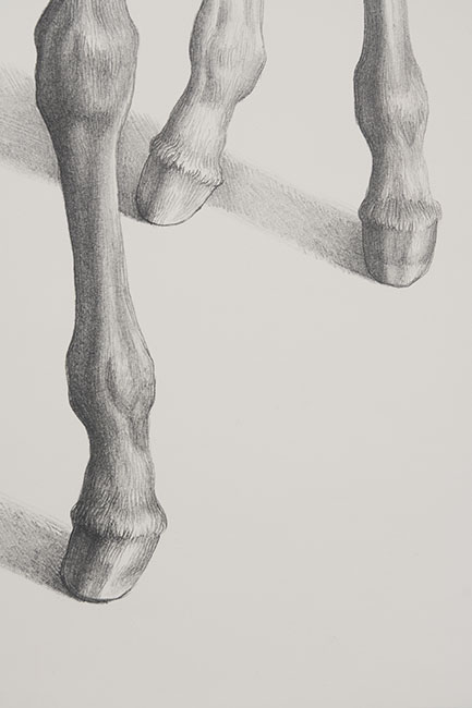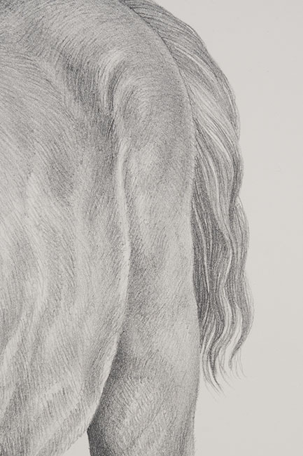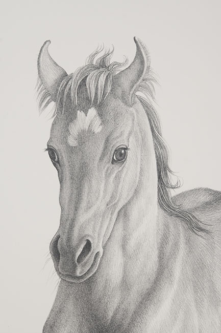 Composición rectangular en disposición vertical. Representación de un caballo joven dispuesto en escorzo, con leve giro hacia la izquierda. La figura se encuentra de pie, con las extremidades delanteras separadas y las traseras ligeramente en retroceso. Destaca un tratamiento detallado de la anatomía, con énfasis en la musculatura, articulaciones y tensiones corporales. La cabeza se presenta erguida, con mirada dirigida hacia el espectador, orejas atentas y crin corta, levemente desordenada. La cola cae hacia un costado en forma suelta. El fondo es neutro, sin elementos contextuales, y se incorpora una sombra proyectada bajo el animal que refuerza su volumen y anclaje en el espacio.