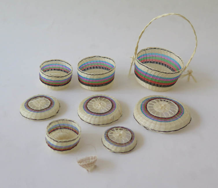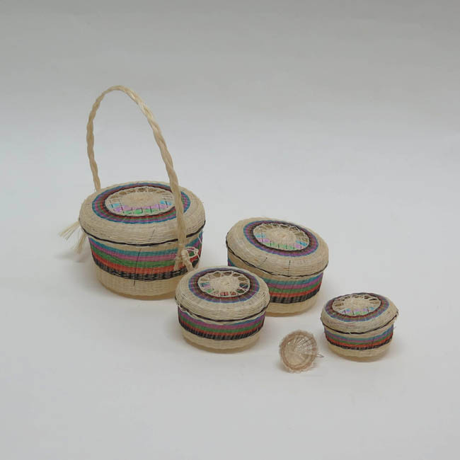 Objeto con volumen, conformado por cinco contenedores y cuatro tapas. Estas piezas tienen forma cilíndrica, de baja altura y de variado tamaño, de tal forma que se insertan una dentro de otra. Su color de base es claro, dedoradas con franja central en tonos turquesa, fucsia, verde, naranjo y negro. Las tapas son caladas y con franja de los mismos colores que los recipientes. La pieza mayor tiene un asa superior alta y delgada realizada mediante trensado, y borla en forma de abanico en los costados; la pieza menor no lleva tapa, tiene forma cóncava y posee un asa superior delgada.