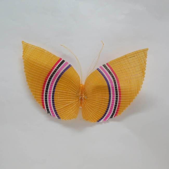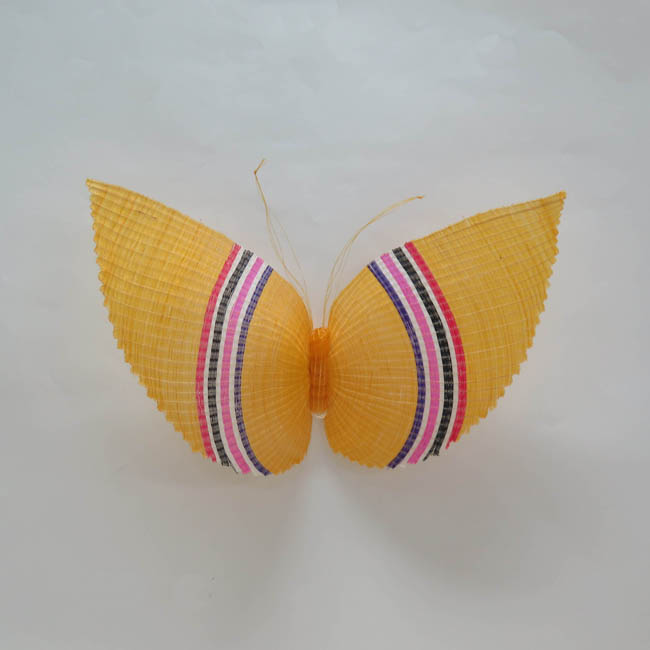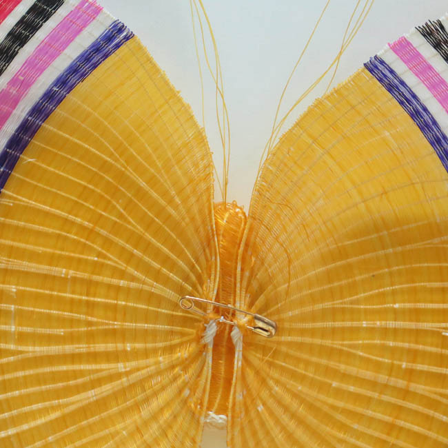 igura zoomorfa tejida, que representa una mariposa amarilla, con alas decoradas con franjas verticales de color rojo, blanco, negro, fucsia y morado. Su cuerpo es cilíndrico de color amarillo y sus antenas son largas y amarillas. Por el reverso posee un alfiler de gancho dorado.