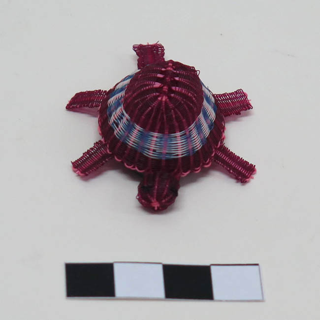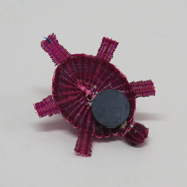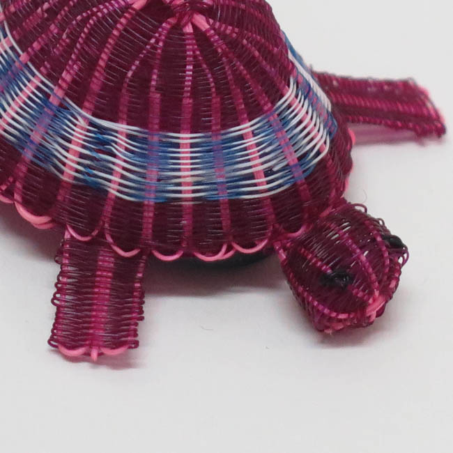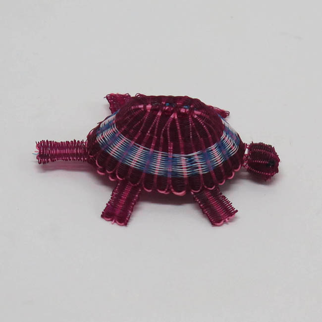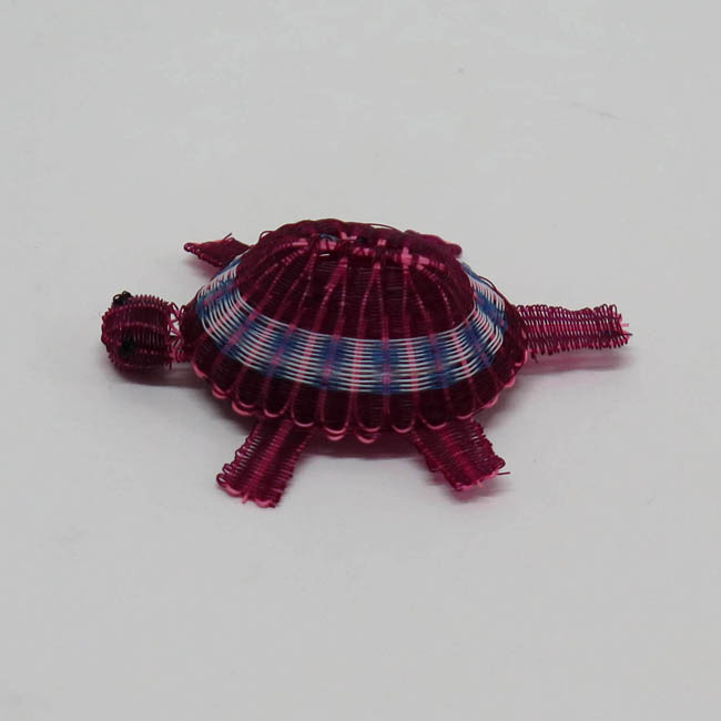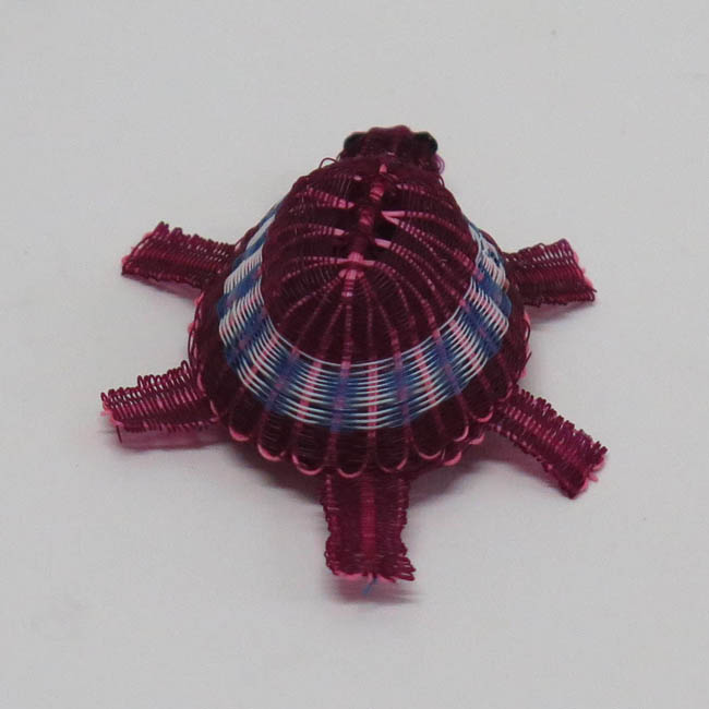 Figura zoomorfa tejida, que representa una tortuga color burdeo, cuyo caparazón está dedorado por su perímetro con franja de color blanco. Sus cuatro patas y su cola son rectas y planas. Tiene ojos negros, pequeños, formados por nudos. Su vientre es plano y posee adherido un imán por debajo.
