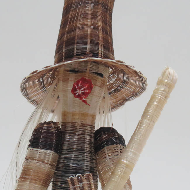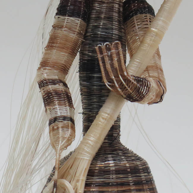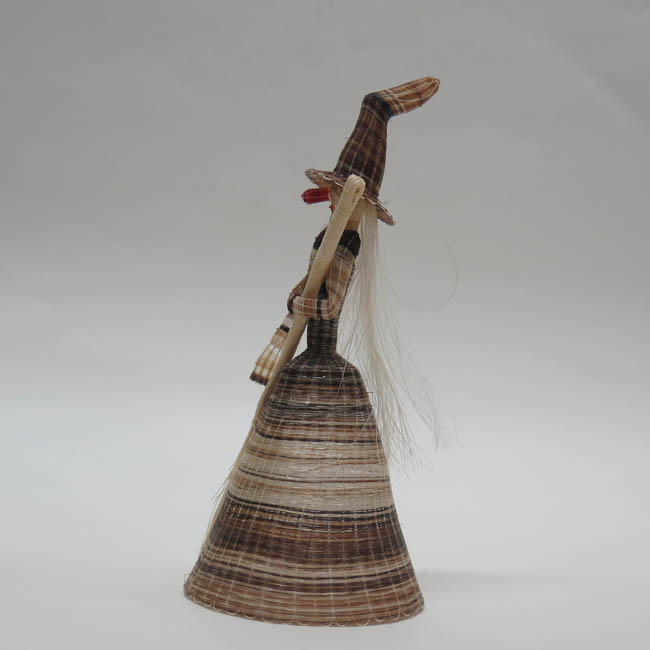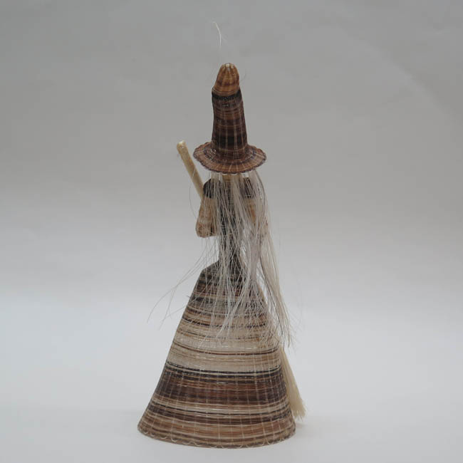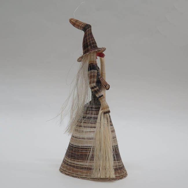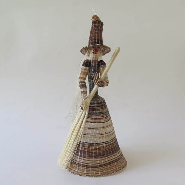 Figura antropomorfa tejida. Representa a una mujer de pie, que lleva sombrero cónico muy alargado y con la punta doblada hacia atrás; tiene pequeños ojos negros, una gran nariz roja, boca pequeña color rojo, y su pelo es largo y de color blanco que cae sobre su espalda; su torso es delgado y viste faldón, el cual tiene forma cónica en color café matizado; con sus manos sostiene una gran escoba blanca, teniendo su mano izquierda a la altura de su pecho, mientras que la derecha va al costado de su cuerpo.