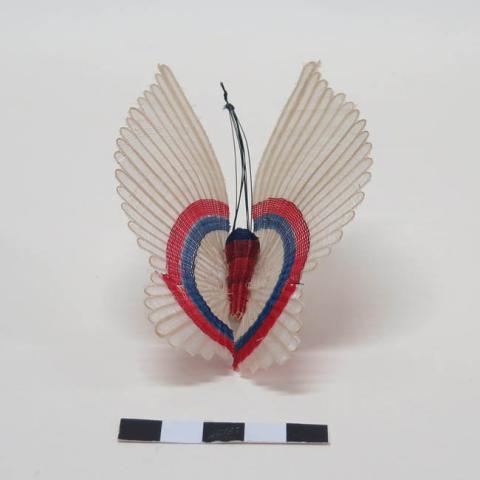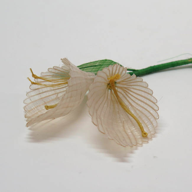 Figura fitomorfa tejida. Corresponde a un ramo con dos flores blancas en forma de capullo cónico, cuyo lado posterior es más alto, dejando ver sus pistilos y estambres que son de color amarillo formados por fibras torcidas y anudadas. Cada flor tiene un tallo que se unen en la parte central mediente un ambarrilado, desde donde también nace una hoja verde alargada.