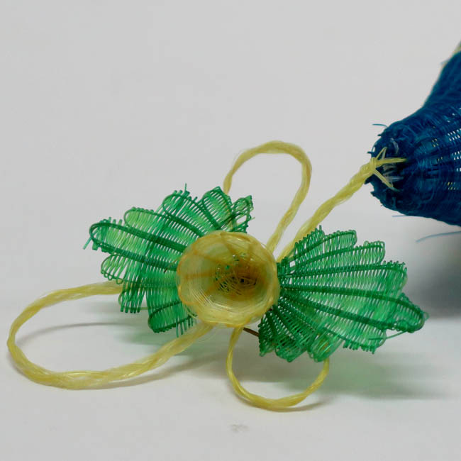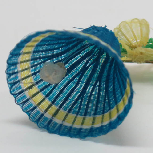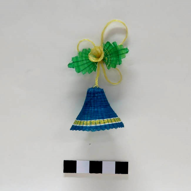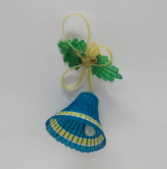 Objeto con volumen, de forma cónica en color azul y decorado en su borde inferior por una franja amarilla ribeteada con blanco y su parte interior cuelga un péndulo blanco. Desde su parte superior suge un lazo amarillo trenzado que forma tres argollas, teniendo además, dos hojas verdes de bordes dentados y al centro una pequeña flor amarilla de forma cónica. Tras las hojas posee una alfiler de gancho dorado.