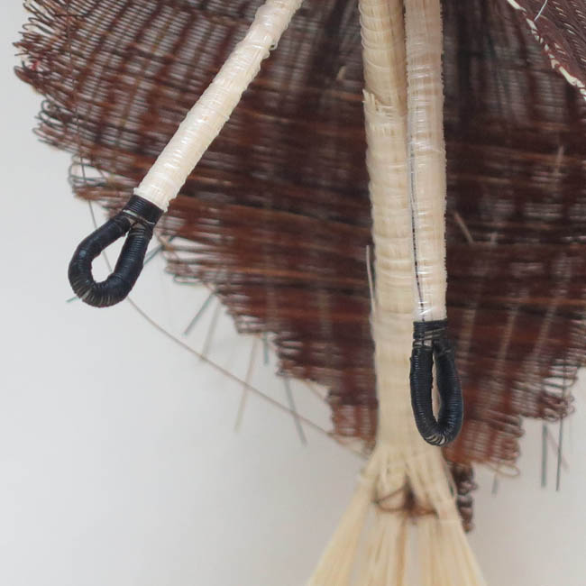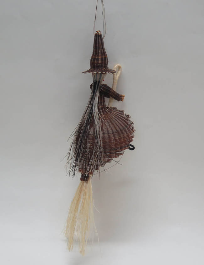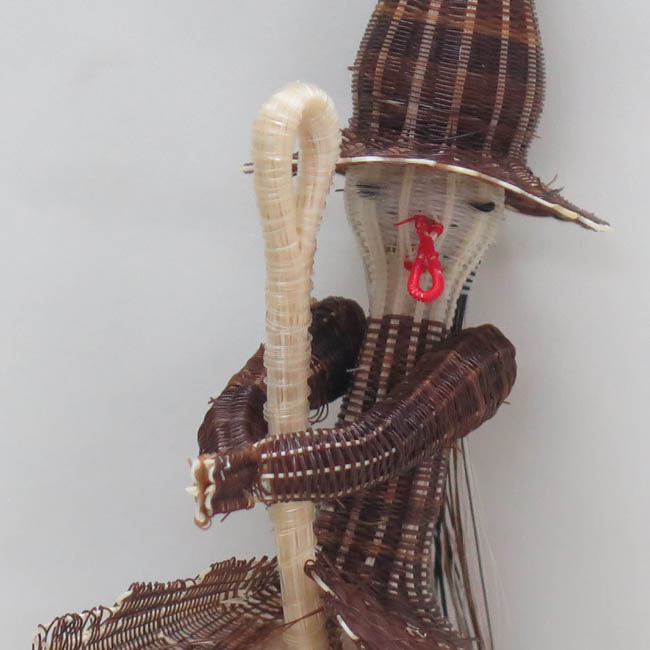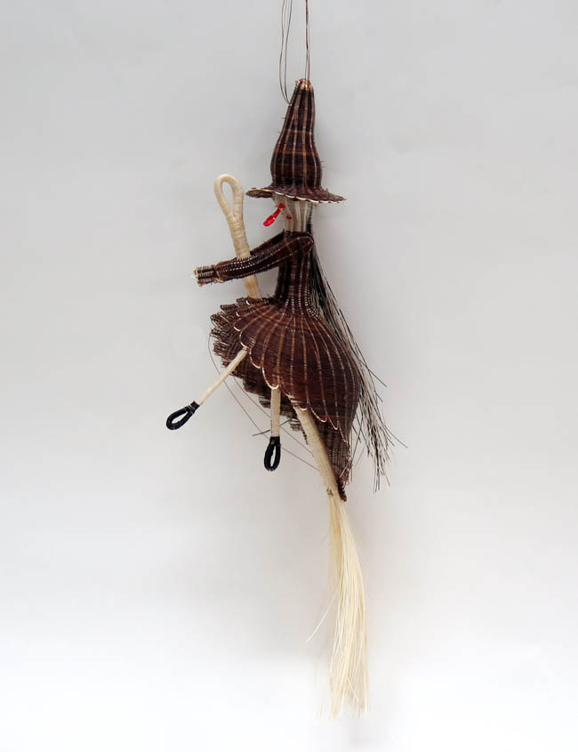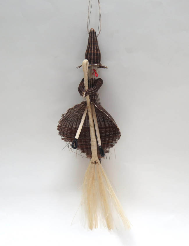 Figura antropomorfa tejida, que representa a una mujer montada sobre una gran escoba de color claro, sujetándola entre sus manos. Lleva sombrero de foma cónica muy alargada y ala angosta. Su rosto es blanco, con ojos pequeños y negros, formados por nudos; su naríz es roja, grande y en forma de ojal; su boca es roja y pequeña. Lleva vestido café, siendo más corto en la parte frontal, dejando ver sus piernas blancas y delgadas, que terminan en pies negros de forma de ojal. Su pelo es matizado entre blanco, negro y café, cayendo sobre su espalda.