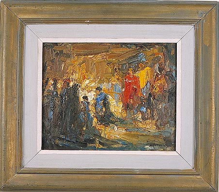 Obra de formato rectangular. Composición en base a grupo de figuras humanas en tonos azul, rojo y marrón; centro iluminado por tonos amarillo y ocre, a la izquierda zona de sombras.