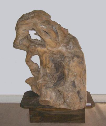 Está conformada por un tronco de madera pulido, dispuesto sobre una base rectangular, de madera más oscura.