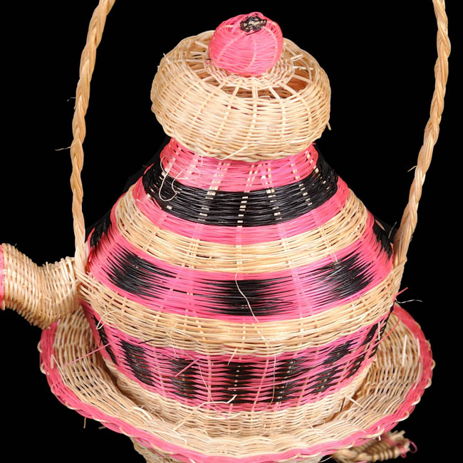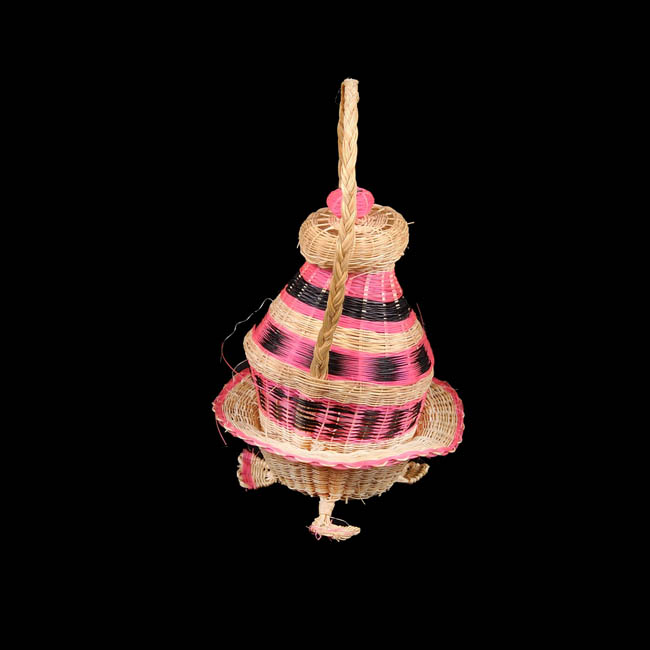 Objeto de uso decorativo. De cuerpo globular, un asa superior, un vertedero y un asidero de color rosado. Esta decorado con franjas horizontales de color fucsia, negro y natural de crin sin teñir. La base de la figura esta inserta en una pieza circular, de base mas angosta que la boca, con borde irregular y tres patas.