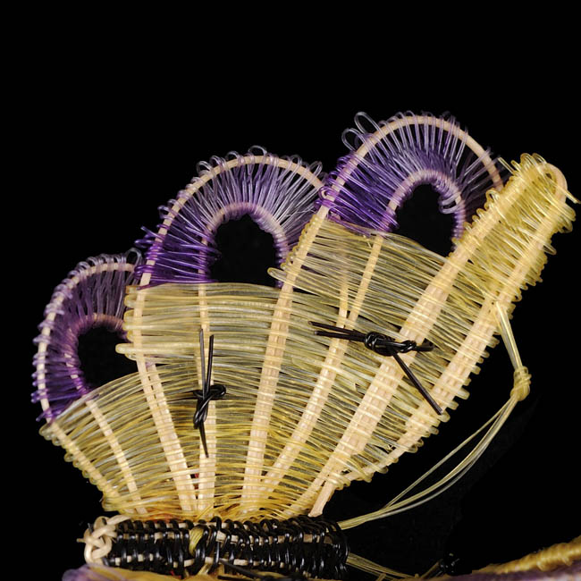 Figura entomorfa de uso personal. Está elaborado a partir de anillos sobrepuestos. Tiene un cuerpo central y dos antenas. Las alas son de color morado y amarillo. El cuerpo es negro y las antenas son amarillas. Esta elaborado en una estructura en ixtle sobre la cual pasa el tejido de crin previamente teñido. Las alas van cosidas al cuerpo. Tiene un alfiler de gancho por el reverso.