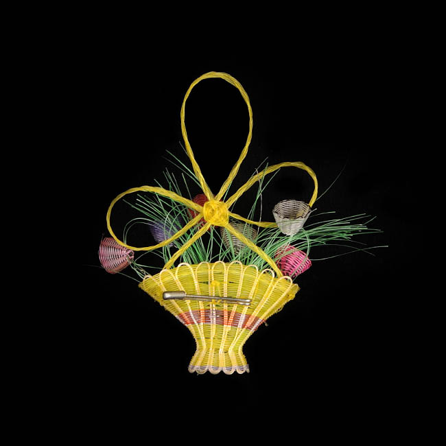 Elaborado en una estructura de ixtle sobre la cual pasa el tejido de crin previamente teñido. Posee un alfiler de gancho por el reverso.