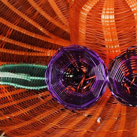 Objeto de uso personal. En forma de sombrero de ala ancha y copa mediana. De color naranja. Decorado con dos esferas moradas con hojas verdes. Elaborado en una estructura de ixtle sobre la cual pasa el tejido de crin previamente teñido. Las esferas son estructuras distintas y están cosidas a la figura principal. Por el reverso un alfiler de gancho.