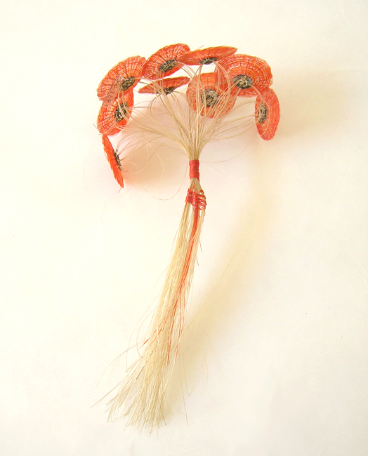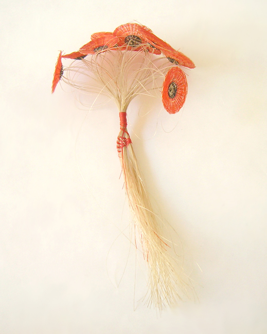 Objeto de uso decorativo. Compuesto por hebras sueltas de crin sin teñir que terminan en nueve figuras cónicas de color rojo.El centro de cada figura es negro y de crin natural sin teñir. Elaborado en una estructura de ixtle sobre la cual pasa el tejido de crin previamente teñido. Lleva un embarrilado en crin de color rojo que permite atar las hebras.