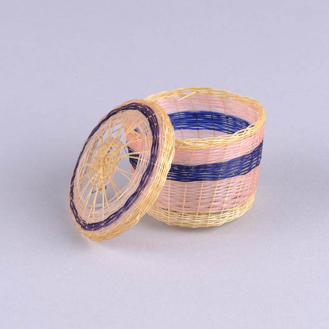 Objeto de uso personal. Es de cuerpo cilíndrico, tiene una tapa de trama abierta. Esta decorado con dos franjas de color rosado y una azul. Elaborado en una estructura de ixtle sobre la cual pasa el tejido de crin previamente teñido.