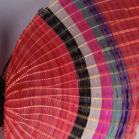 Figura entomorfa de uso personal. Tiene cuerpo negro, dos antenas y alas decoradas con franjas de color morado, verde fucsia, blanco y negro. Esta hecho sobre una estructura de ixtle sobre la cual pasa el tejido de crin previamente teñido. Las alas son estructuras distintas y van cosidas a la figura central. Posee un alfiler de gancho por el reverso de la figura.