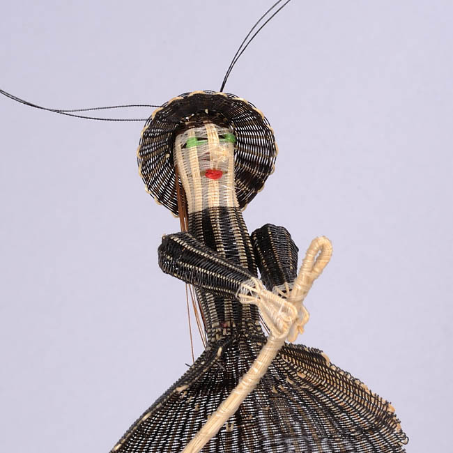 La figura central es una estructura de ixtle sobre la cual pasa el tejido de crin. Brazos, sombrero y escoba son formas distintas y están cosidas a la figura central.