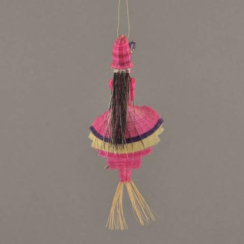 Objeto antropomorfo femenino de uso decorativo. Es una mujer sentada sobre la representación de una escoba que sujeta con sus manos. Lleva un vestido, con un sombrero de ala corta y copa alargada. Su pelo es largo y negro y posee una gran nariz alargada. De color fucsia con franjas de color amarillo y morado.