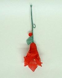 Objeto de uso decorativo.De forma acampanada con una larga vara y una flor en botón. Es de color rojo. Elaborado en una estructura de ixtle sobre la cual pasa el tejido de crin previamente teñido.