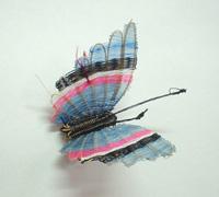Objeto de personal. Tiene un cuerpo central y dos antenas, una mas corta que la otra. Las alas son celestes y están decoradas con franjas de color negro, blanco y rosado.