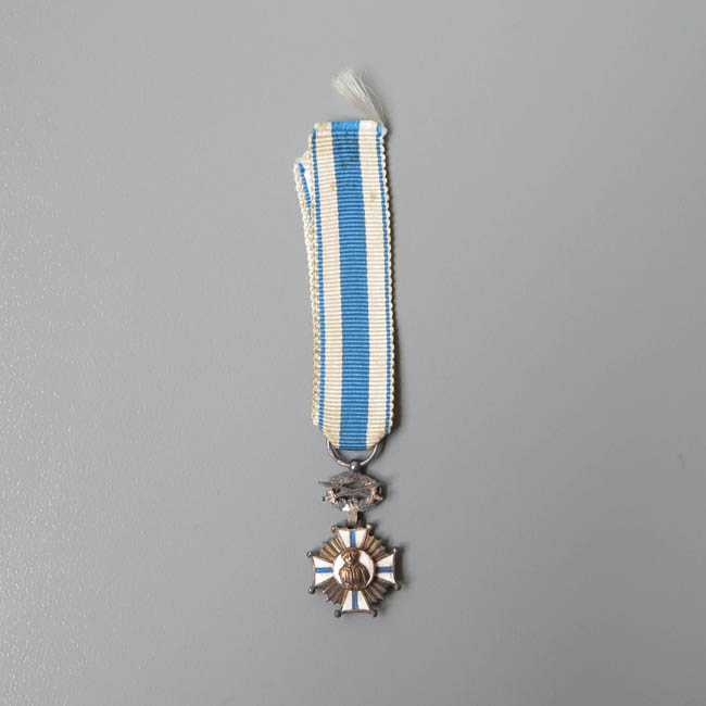 Conjunto formado por medalla y botón, de uso personal. Uno de los objetos está conformado por cinta delgada y listada en color celeste y blanco intercalado. Hacia su parte inferior cuelga una piocha desde una argolla, la cual tiene una corona de laureles cruzada por dos sables; y luego posee una cruz en esmalte blanco con azul con puntas rematadas en pequeñas esferas; con rayos intercalados entre los brazos; y al centro presenta una figura antropomorfa por una cara y un escudo por el otro.