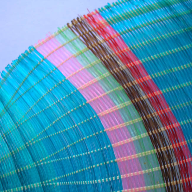 Objeto de uso personal. Tiene un cuerpo central y dos antenas. Las alas son calipso y están decoradas con franjas de color rojo, café, verde y rosado. Esta hecho sobre una estructura de ixtle sobre la cual pasa el tejido de crin previamente teñido. Las alas son estructuras distintas y van cosidas a la figura central. Lleva un alfiler de gancho por el reverso para prenderlo a la ropa.