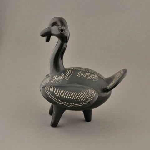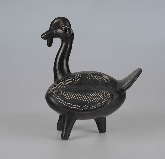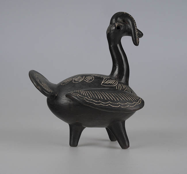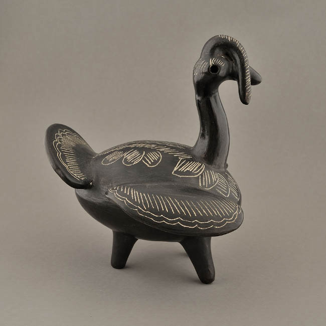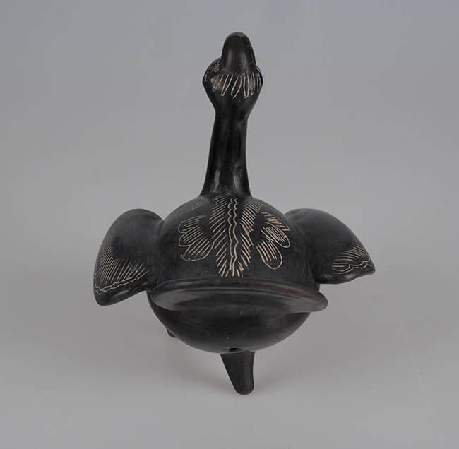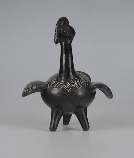 Figura zoomorfa que representa un pavo hembra. Detalle de cresta ladeada, alas y cola extendida. Tres patas. Cavidades a modo de ojos. Superficie negra pulida. Decoración incisa con pasta blanca.