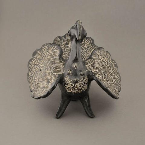 Figura zoomorfa de cerámica que representa a un una pavo real de tres patas. Detalle de cresta y protuberancias en el pecho. Alas y cola extendida. Superficie negra bruñida. Decoración incisa con pasta blanca.